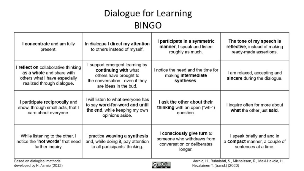 The idea behind bingo is to develop dialogue skills one skill at a time. It can be used in a group and community in many different ways— flipped, embedded in working methods, or as a deeper content for developing interaction skills. The aim is to encourage each participant to explore their own typical ways of interacting and to develop them in a more dialogic direction. The use of bingo helps the learning community to group together and support various group processes, including collaborative learning skills.