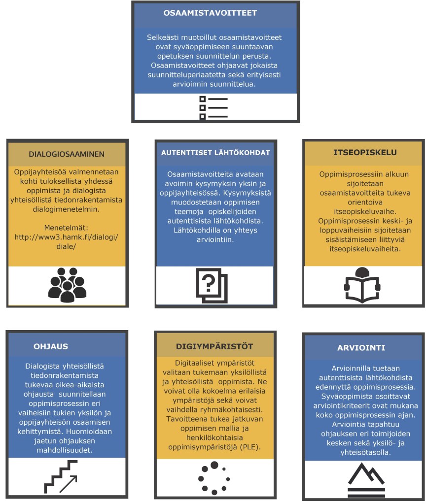 Tarkasti strukturoidun pedagogisen mallin rinnalle kehitin syväoppimisen suunnitteluperiaatteet (Ruhalahti, 2019; 2022), jotka tukevat dialogista, digitaalista ja syväsuuntautunutta oppimista. Nämä seitsemän pedagogista mallia tukevat suunnitteluperiaatteet ovat: